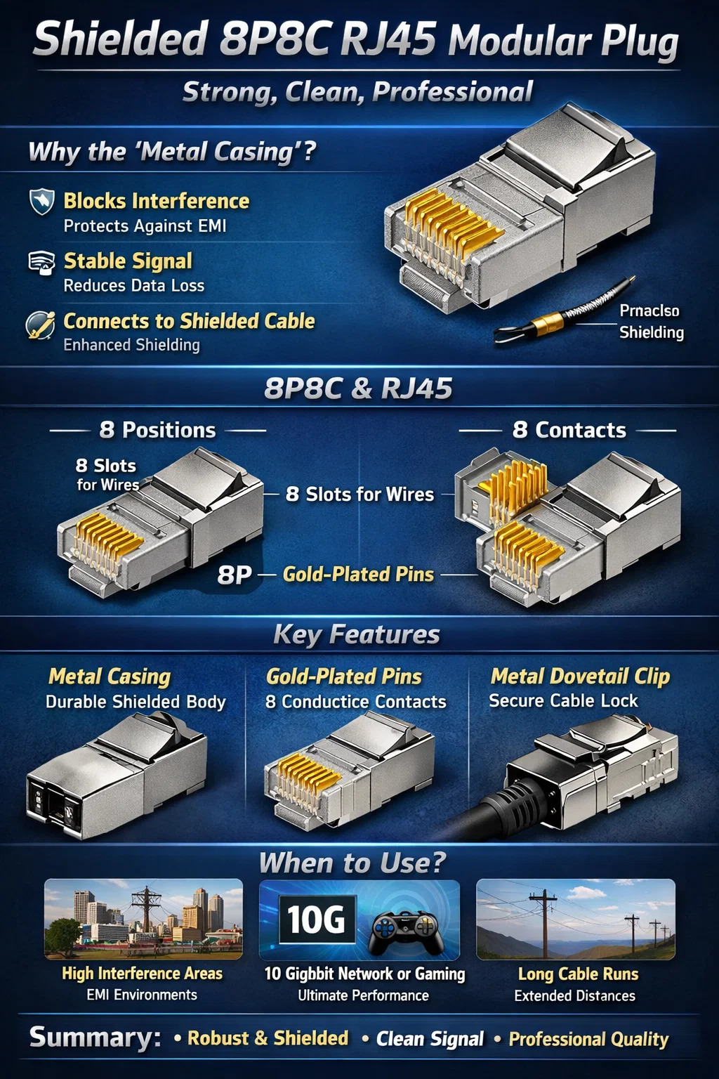 Uzun mesafeli kablolama için: Kablo ne kadar uzun olursa, parazite karşı o kadar hassas olur ve bu korumalı konnektörün kullanışlı olduğu yer burasıdır.