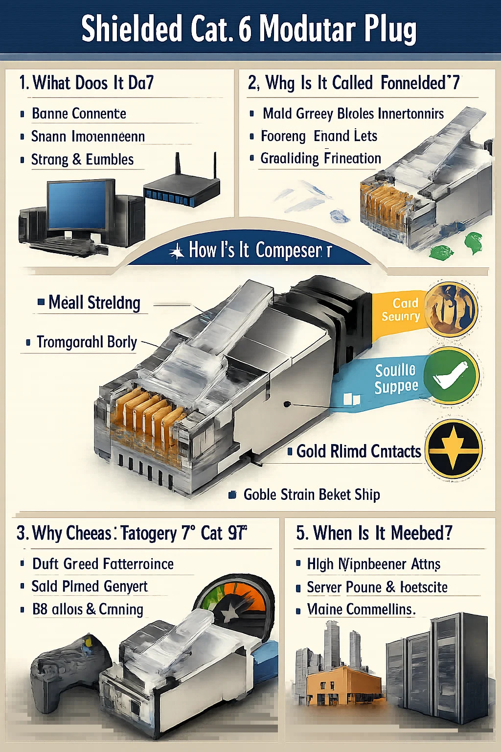 Bu korumalı Cat.6 modüler fiş Basitçe söylemek gerekirse, "koruyucu kalkana" sahip bir ağ kablosu konektörüdür. Parlak metal kasalı ağ kablosu konektörleri gördüyseniz işte bu kadar.