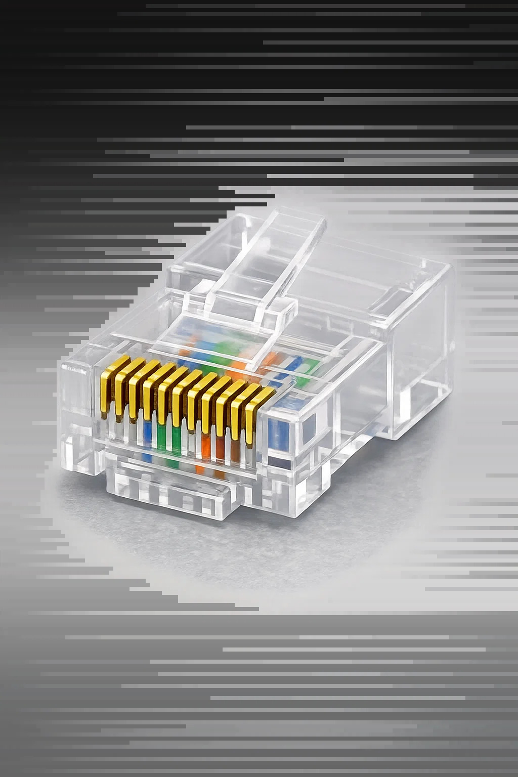 Tamamen plastik malzeme: Bu korumasız 10P8C Cat.5e modüler fiş, dış tarafında parlak metal kasa olmaksızın tamamen şeffaf veya yarı saydam plastikten yapılmıştır.